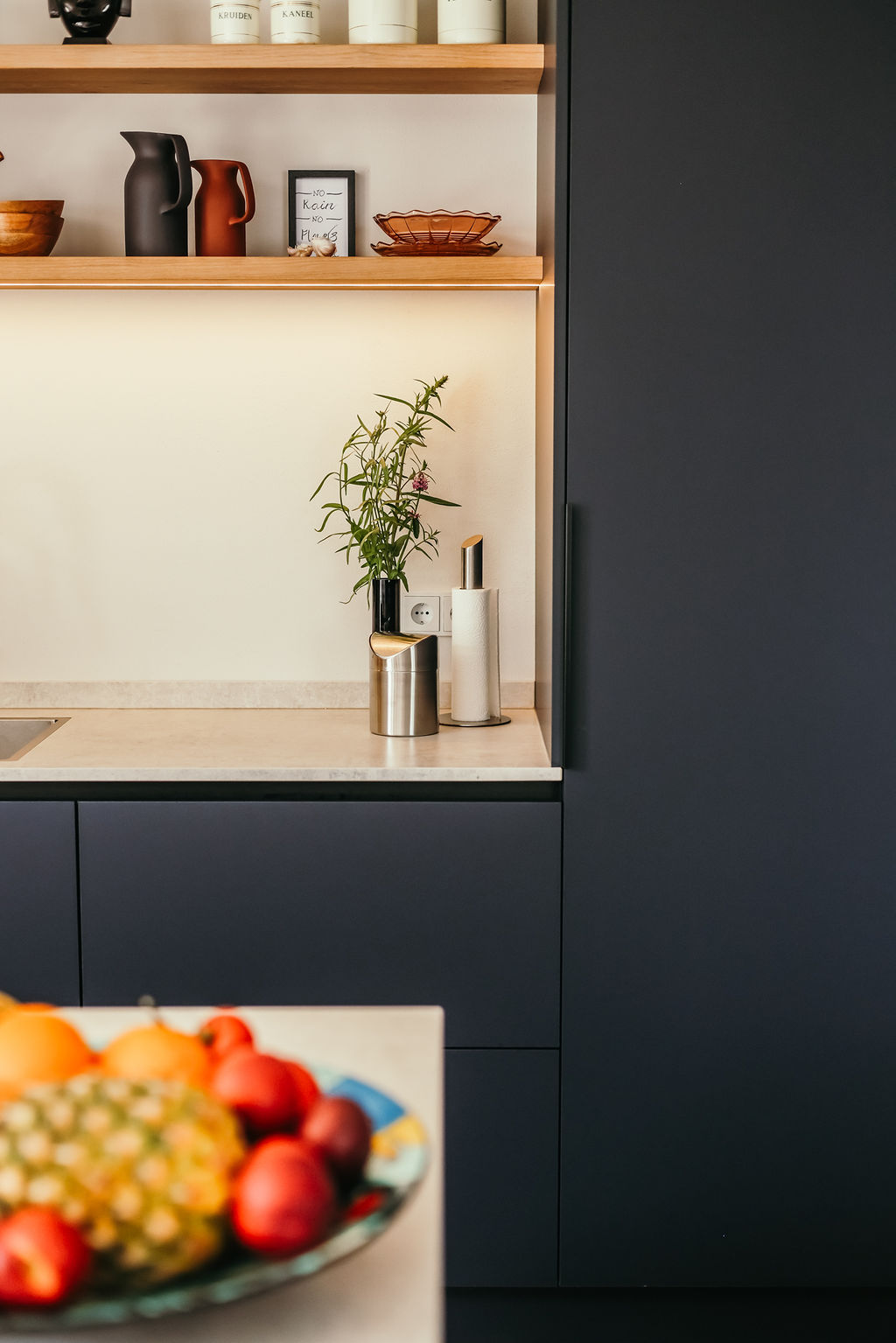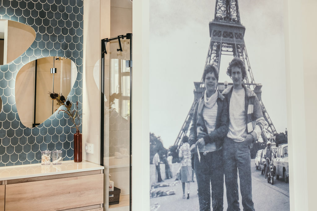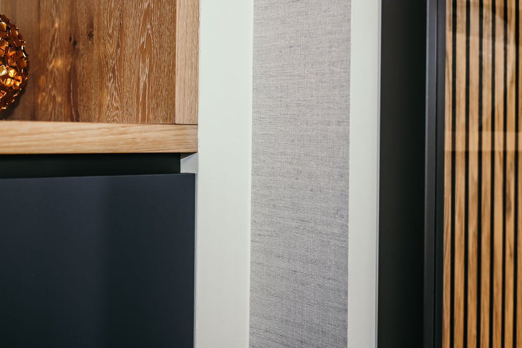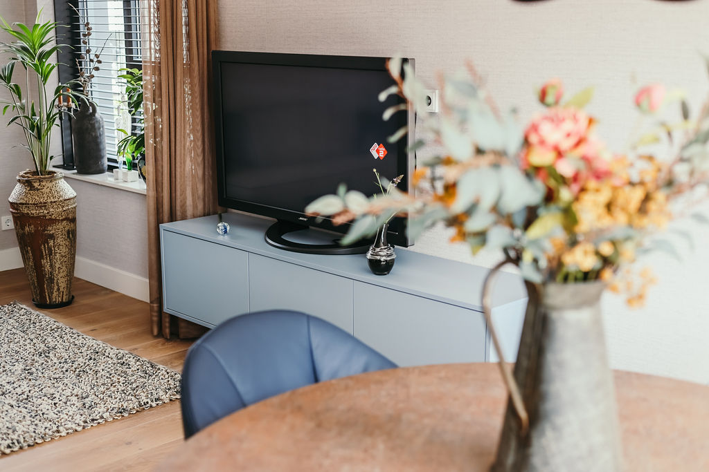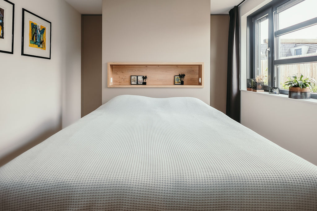 Deze opdrachtgevers, uit het westen van ons land, hadden tijdens hun vele camperreizen het prachtige noordoosten ontdekt en besloten om in Hardenberg een seniorenwoning te laten bouwen. Ze kwamen bij mij terecht na een uitgebreide selectie op internet. De eerste kennismaking beviel aan beide kanten uitermate goed en zo mocht ik een compleet interieurplan maken en hun begeleiden in het bouwproces. Een heel fijn proces want beiden hadden ze ruime ervaring in het procesmatig werken wat leidde tot duidelijke en snelle beslissingen. Samen met schilder, behanger, interieurbouwer en parketteur hebben we, vind ik zelf, een prachtig resultaat neergezet met ook hier weer een geweldige inbreng van de opdrachtgevers zelf. Kijk alleen eens naar de smaakvolle tuin die de vrouw des huizes zelf ontworpen heeft en nog steeds in ontwikkeling is. Beneden is een hal met doorlopend een bijkeuken waar een maatwerkkast is geplaatst voor wasmachine, droger en opberg. Achter de akoestische panelen zit de meterkast weggewerkt en ook de ruimte onder de trap is goed benut met opbergmogelijkheden. Naar links de doorgang naar woonkamer/keuken. Ook de masterbedroom met badkamer is beneden. Op de verdieping zijn er dan nog 2 slaapkamers te vinden met ook hier een badkamer. Door goed te kijken naar de routing en opbergmogelijkheden is de ruimte optimaal benut.