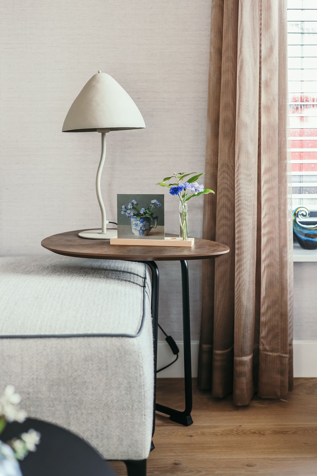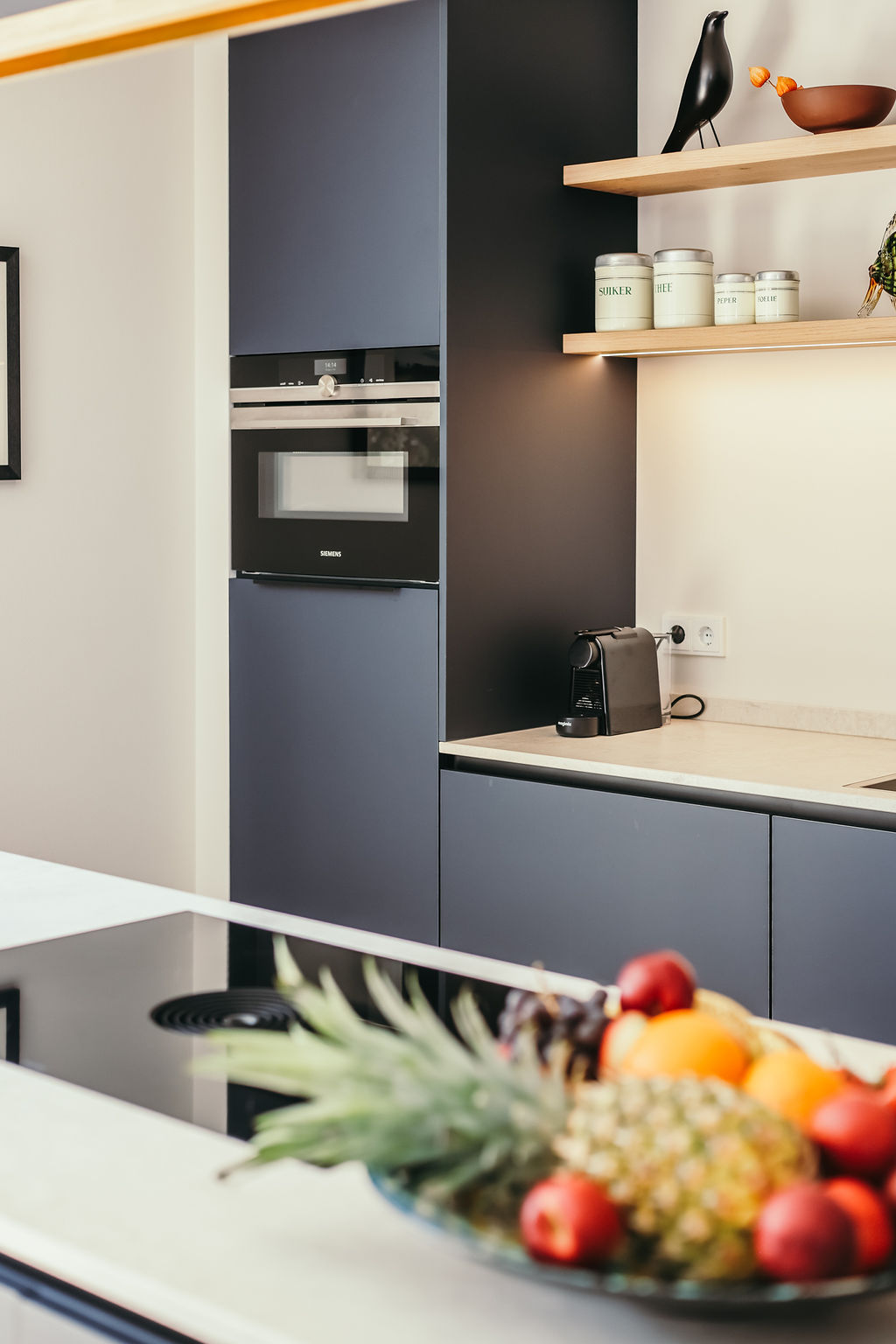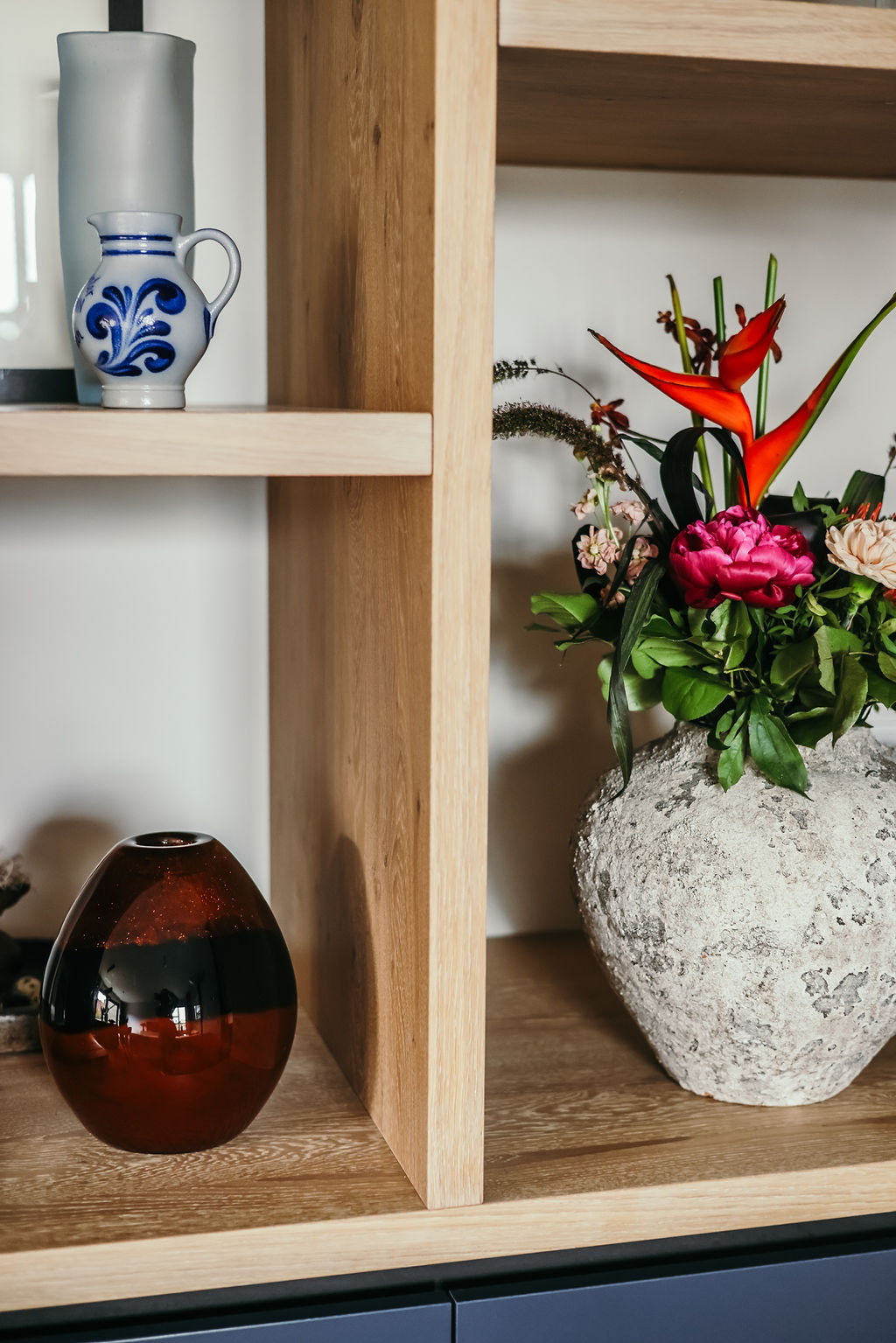 Deze opdrachtgevers, uit het westen van ons land, hadden tijdens hun vele camperreizen het prachtige noordoosten ontdekt en besloten om in Hardenberg een seniorenwoning te laten bouwen. Ze kwamen bij mij terecht na een uitgebreide selectie op internet. De eerste kennismaking beviel aan beide kanten uitermate goed en zo mocht ik een compleet interieurplan maken en hun begeleiden in het bouwproces. Een heel fijn proces want beiden hadden ze ruime ervaring in het procesmatig werken wat leidde tot duidelijke en snelle beslissingen. Samen met schilder, behanger, interieurbouwer en parketteur hebben we, vind ik zelf, een prachtig resultaat neergezet met ook hier weer een geweldige inbreng van de opdrachtgevers zelf. Kijk alleen eens naar de smaakvolle tuin die de vrouw des huizes zelf ontworpen heeft en nog steeds in ontwikkeling is. Beneden is een hal met doorlopend een bijkeuken waar een maatwerkkast is geplaatst voor wasmachine, droger en opberg. Achter de akoestische panelen zit de meterkast weggewerkt en ook de ruimte onder de trap is goed benut met opbergmogelijkheden. Naar links de doorgang naar woonkamer/keuken. Ook de masterbedroom met badkamer is beneden. Op de verdieping zijn er dan nog 2 slaapkamers te vinden met ook hier een badkamer. Door goed te kijken naar de routing en opbergmogelijkheden is de ruimte optimaal benut.